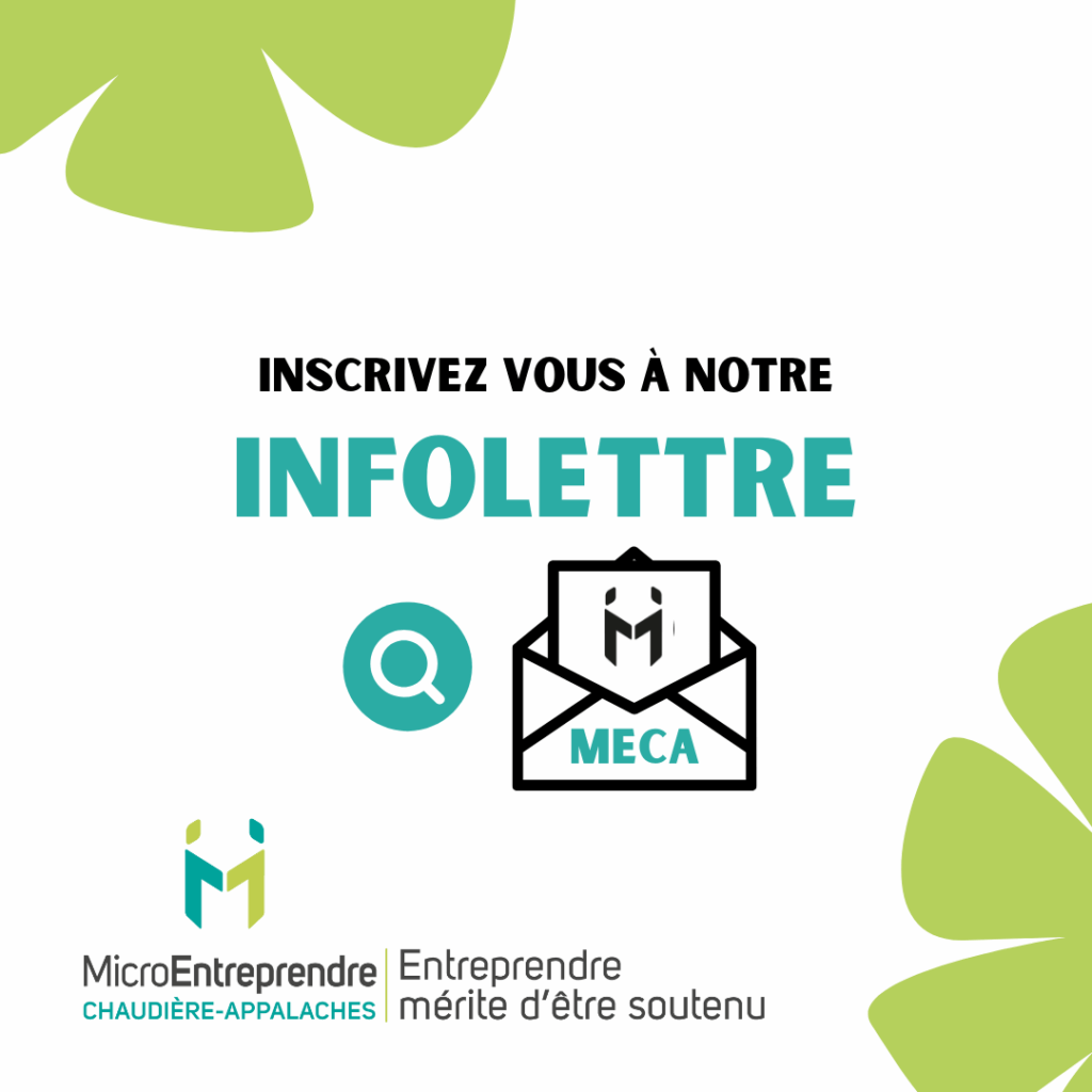 Au courant des prochaines semaines, nous lancerons officiellement l’infolettre MECA, qui sera transmise 4 fois par année. Ainsi, pour ne rien manquer, vous pouvez vous déjà vous inscrire à l’infolettre MECA en vous rendant dans le bas de la page d’accueil. Pour de plus ample renseignement, vous pouvez communiquer avec nous par courriel à info@microentreprendreca.org.